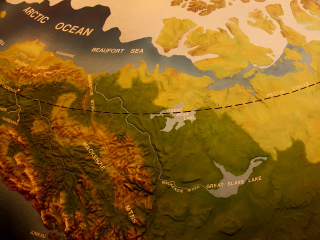 As we pass alongside Great Slave Lake toward Yellowknife, the landscape changes dramatically. Giant red rock formations, the exposed Pre-Cambrian Shield, look formidable, hard surfaced, and unbroken. Hundreds of miles north of here this ancient rock is the source for diamonds, only discovered in 1991. After the gold mines had played out, the discovery of diamonds was a windfall for Northwest Territories. The first mine was built in 2006, followed by others in 2007 and 2008. Now the place registers third in world diamond production and the mining business has pumped $2.4 billion in the local economy.