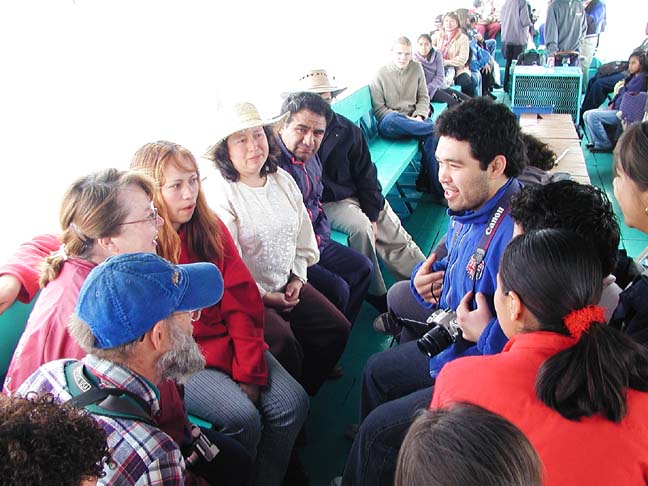 Shari talking with Mexican tourists on boat to island of Janitzio in Lago de Patzcuaro, Michoacan